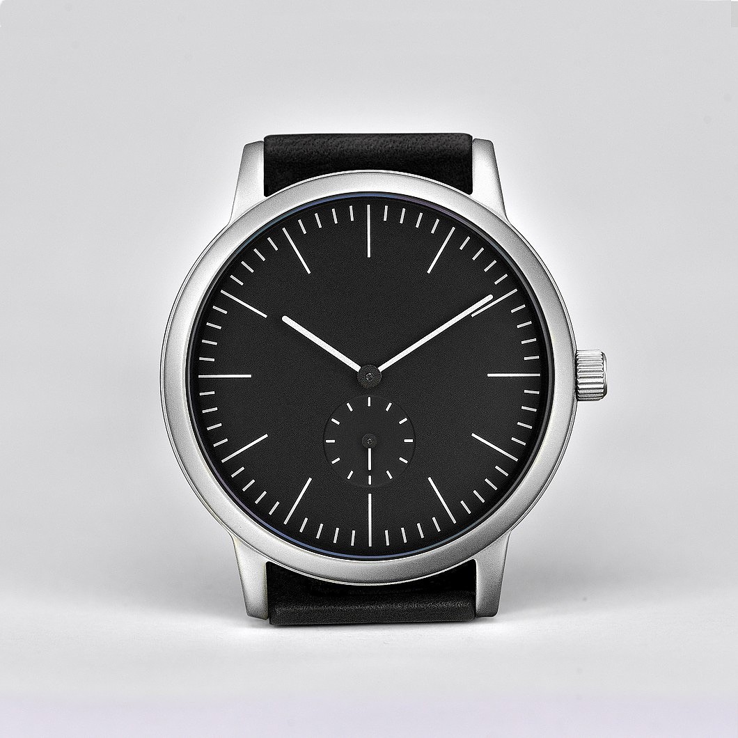 Die Defakto Vektor Modul ist eine Homage an die erste Version der Vektor. Die Uhr transferiert das klassische 50er Jahre Uhren-Design hin zu einer eigenständig minimalistischen, zeitgenössischen Ästhetik. Sie kommt im 6,8mm flachen Ickler Edelstahlgehäuse mit einem Durchmesser von 39mm und grob sandgestrahlter, matter Oberfläche. Inklusive dem gewölbtem Acrylglas hat die Uhr eine Höhe von 9,8mm. Die dem konvexen Zifferblatt folgenden, handgebogenen Zeiger sind perfekt auf die feinen Indexe abgestimmt. Stunde und Minute sind farblich passen zum Gehäuse angelegt, die konstant fließende Sekunde grenzt sich, im Sinne einer guten Lesbarkeit, in rot ab. Die Defakto Vektor Modul verfügt über eine Wasserdichte von 30m / 3Atm. Die Uhr ist in dieser Version auf 20 Stück limitiert.